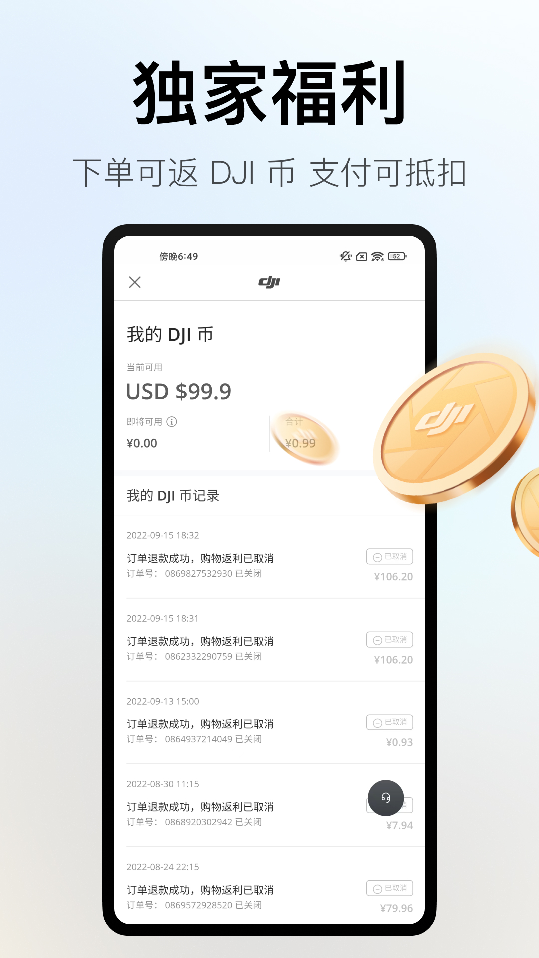 【独家权益】1. 购物返 DJI 币,可用于支付商城内任意订单。2. 独家买赠,部分主机送限量周边。3. 以旧换新,更低价换新机。4. 每月促销,专属优惠早知道。