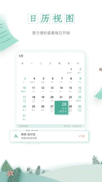 通过日历视图,可方便添加账单并查看每一天的开销信息,一目了然。