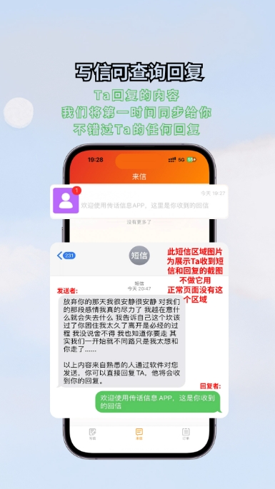 匿名短信发送:用户可以通过传话消息软件编辑并发送匿名短信,内容涵盖情感表达、表白、道歉、祝福等多个方面。发送后,短信将通过随机106段号码发送给对方,确保匿名性。