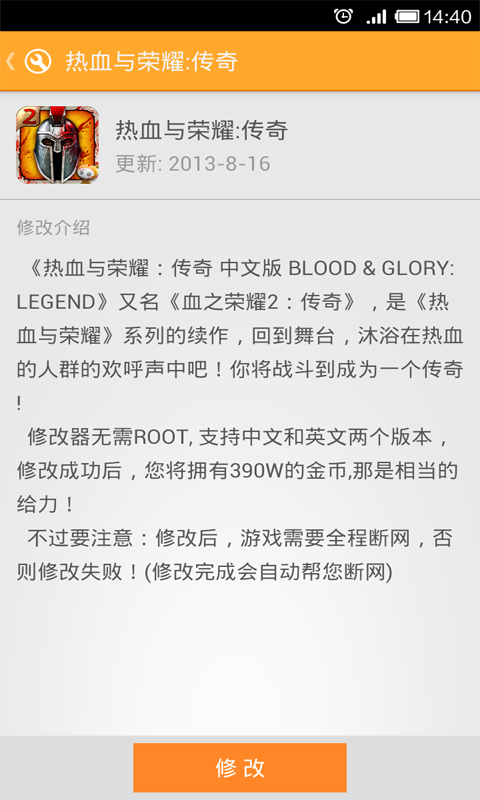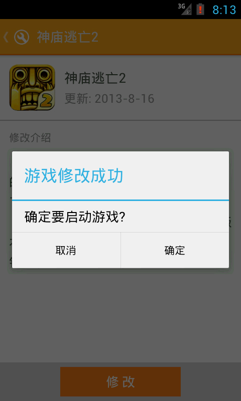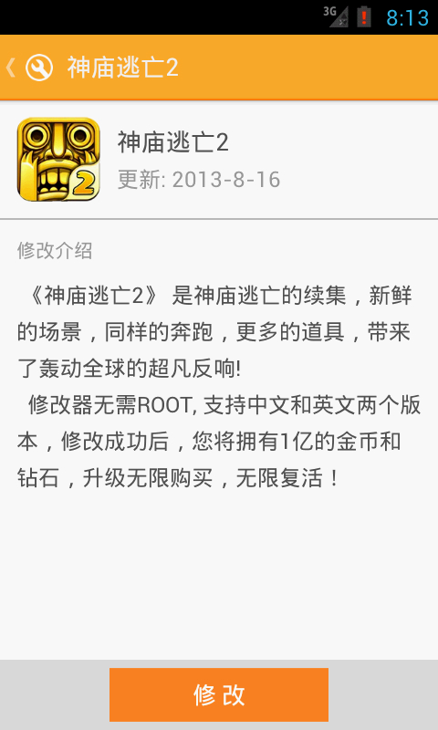 Android平台的游戏修改器,无需要root,就可以修改游戏存档,增加游戏金币和经验值。当前可修改的游戏有神庙逃亡2,修改成功之后,您将拥有1亿的金币和钻石,升级无限购买,无限复活;Glu的所有游戏,修改成功后,您将拥有390W的金币,那是相当的给力。