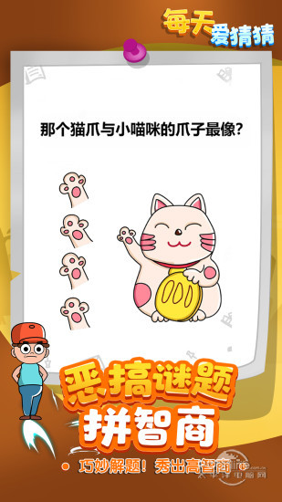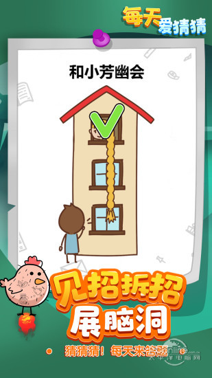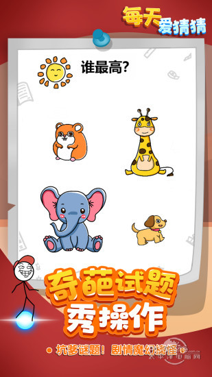 《每天爱猜猜》是一款纯脑力游戏,开动脑筋训练思维,来测试下你的智商吧!打开你的脑洞,来挑战你的智商吧,这是一款休闲益智又具有挑战性的问答游戏。和传统的问答问题不同,这款游戏更像一款“脑筋急转弯”,需要更多的思考,有时候还需要反向思考,才能够答对问题。 游戏中是非常有意思的关卡设计,涉及了天文地理,语文数学等等学科,在答题的同事开动你的脑筋,还能够学习知识点。关卡有一部分是动脑筋的问答,有一部分是需要考验操作的益智,动手又动脑,让你的手脑并进,不断提升。 简直欲罢不能,妈妈再也不用担心我的智商啦!