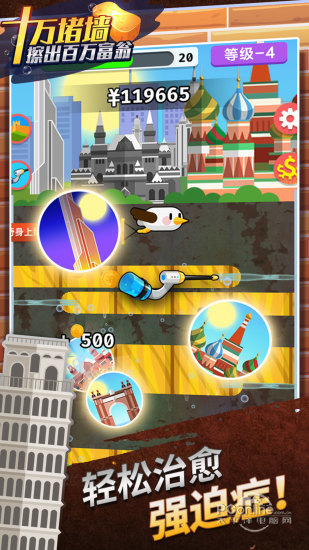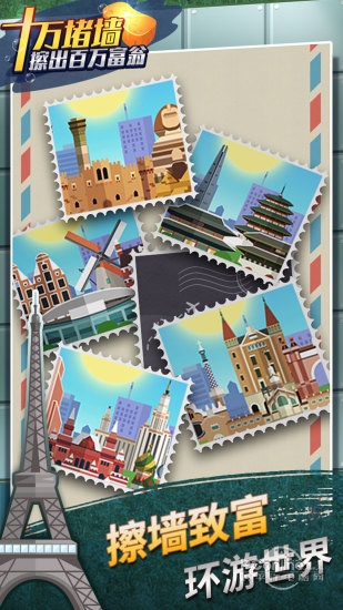 在游戏中,玩家将化身为一位勤劳擦墙工,靠清洁墙壁来换取金币环游世界。动一动手指,抹去墙上的污渍和顽垢;擦一擦墙壁,展现出一座城市的风土和情怀。在愉快的劳动中获得百万金币,升级劳动工具,提高擦墙效率。擦更多的墙,赚更多的钱,游历更多的城市,收集更多的邮戳,擦墙中环游世界,领略不同城市间的别样风采!