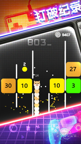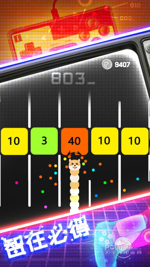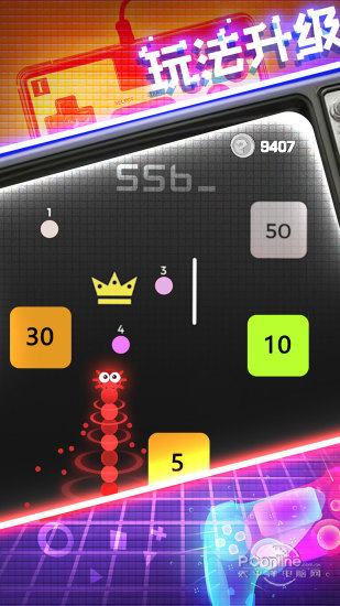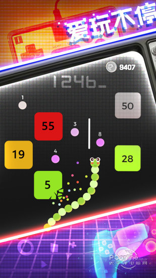 只需要用手指滑动,引导贪吃蛇收集各种食物,增加自己血量,撞击比自己小的数字方块,便可获得高分。