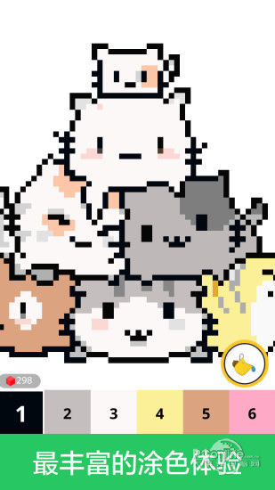 - 超多2D像素艺术作品以满足任何喜好:皮卡丘、动物、曼荼罗、图形、动物、鸟类、花卉、建筑、食物以及许多其他种类;并且持续更新中 - 大量漂亮的图画:探索每日更新的供你填色的新图集; - 像素相机:拍自拍或者使用任何照片,都可以生成像素图片填色! - 作品集:所有填完颜色的作品都会被保留,且支持分享各大平台