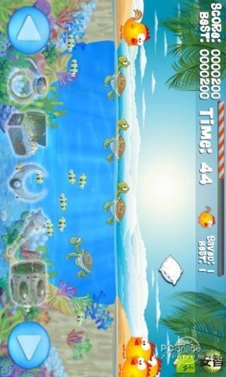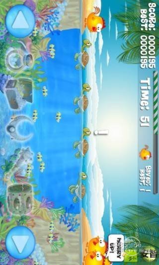 游戏里面小鸡乌龟都非常可爱,一款很容易上手,充满无限乐趣的休闲游戏,帮助小鸡从海龟背上安全度过,到达彼岸拯救它的伙伴们,不过很考验你的反应力哦~色彩艳丽。
