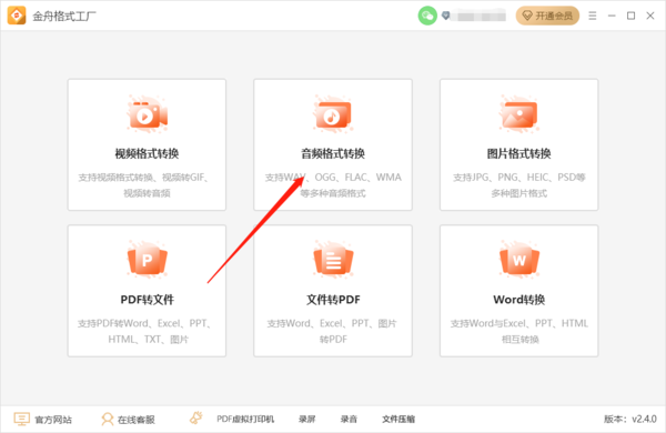金舟格式工厂是一款格式转换软件,功能包括音频格式转换,视频格式转换,图片格式转换,PDF转文件,文件转pdf,word转换。是转换功能比较全面的软件,金舟格式工厂拥有会员付费功能,开通会员不加水印,不限次数,使用功能不限制,那么金舟格式工厂如何使用音频格式转换呢,继续跟随小编往下看吧!