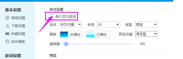 是可以自定义的,我们重复上述的方法,在最后的步骤中,页面上方可以勾选【单行显示歌词】,勾选后桌面提词就变成单行显示了,不勾选的话就是双行显示。