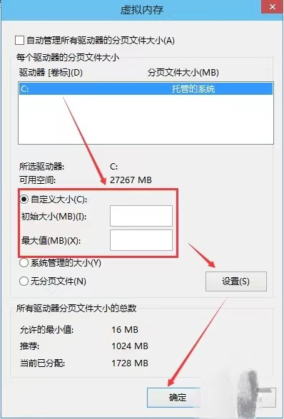 6,如下图所示,在虚拟内存的页面,可以对“初始大小”和“最大值”进行手动设置,设置好以后点击下方的“确定”按钮,这一步千万不要忘记。