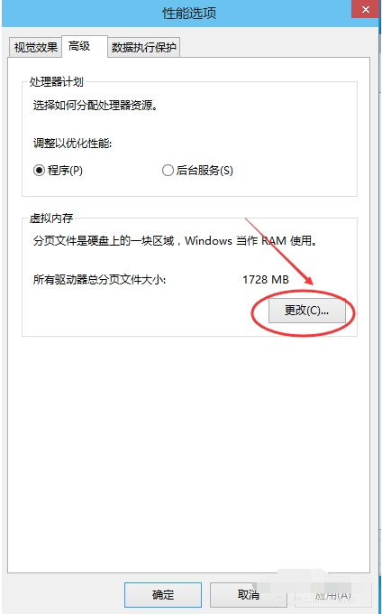 4,然后找到“性能”选项里的“高级”这一栏,并点击下方的“更改”按钮,就可以对虚拟内存进行调整。