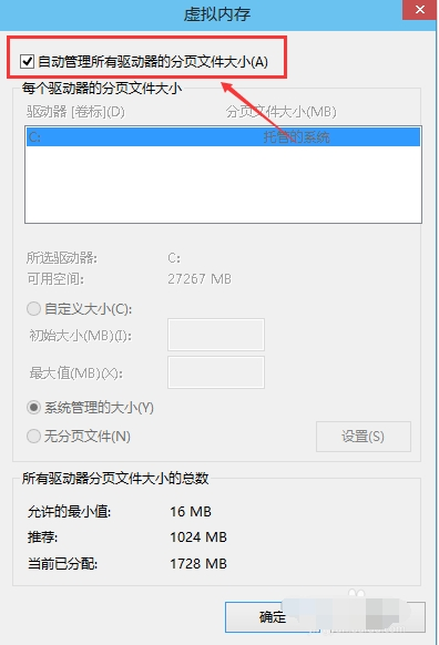 5,最后就进入到了虚拟内存的设置页面,把“自动管理所有驱动的分页文件大小”前面的勾选关闭掉。