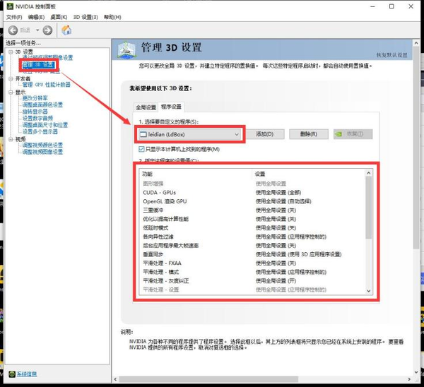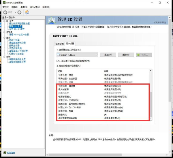 六、在管理员权限的页面,打开“NVIDIA”卡设置,找到“WHISPER MODE、图形增强、BATTERY BOOST”的设置,然后如果有一些游戏的画面会闪烁不流畅。也可以通过NVIDIA控制面板进行调整,注意需要找到“Lei Dian Mo Ni Qi”以及“leidian”两个进程,然后对照下图进行调整。