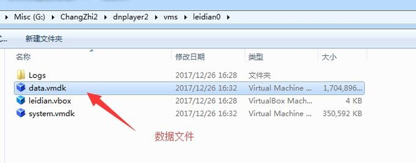 3、找到雷电模拟器损坏的文件夹,里面就会有data.vmdk文件,这就是模拟器的数据文件。
