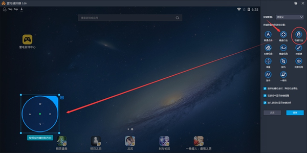 像英雄联盟一样使用鼠标的左键点击屏幕画面或者使用键盘右键来进行行走,到指定位置以后进行保存就可以了,一般方向键的设置都是在画面的左半部,类似于王者荣耀手游和英雄联盟手游,雷电模拟器的对于方向键的默认按键是键盘的wasd字母,当然了,玩家也可以进行自定义。