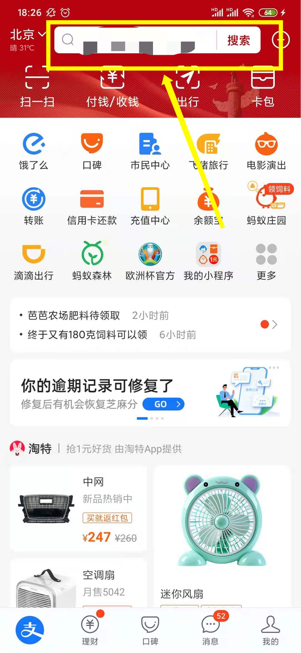 第一步,点开支付宝App,在上方搜索栏输入红包点击搜索;