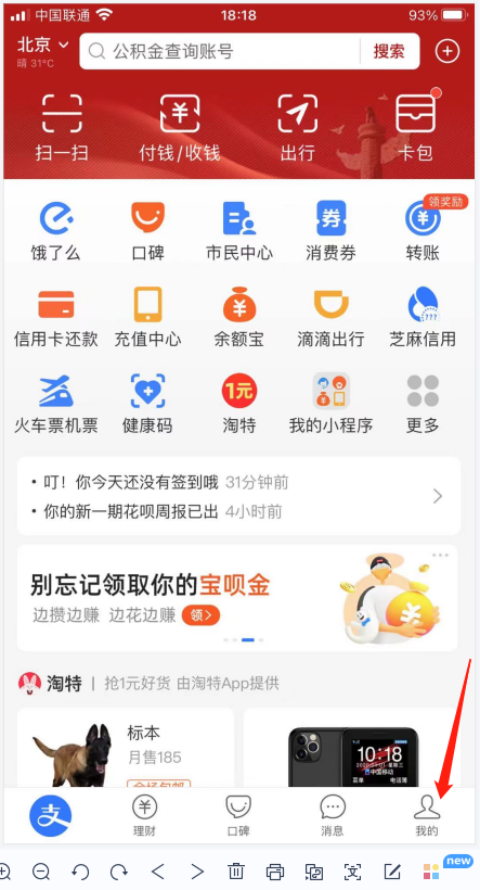 首先第一步:打开支付宝,进入到主界面后,点击我的。