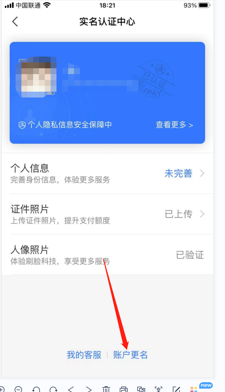第四步:进入到实名认证中心界面后,点击最底下账户更名。