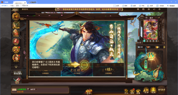 三国杀是一款集角色扮演、战斗、收集、养成于一体的社交卡牌游戏,让你无需下载,便能扮演耳熟能详的三国角色,在颠覆性的历史舞台中,演绎一段扑朔迷离的较量。你既能约上三五好友,群英荟萃,激战不休;又能与AI机器人对弈,随时随地,快速对决;还能参与官方比赛,奖励不断,惊喜连连。