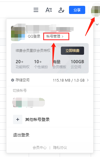 1、登陆腾讯文档,点击文档右上角的头像,之后点击【账号管理】;
