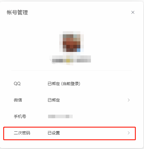 2、随后在账号管理的窗口中,点击下方的【二次密码】;