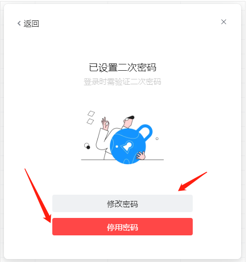 如果大家已经设置过二次密码,想要修改或者停用的话,依然是按照上面的步骤点击,随后出现如图所示窗口,在这里选择修改或停用即可,修改或停用需要验证设置密码时填写的手机号。如果手机不在身边的话,也可以选择填写验证问题。