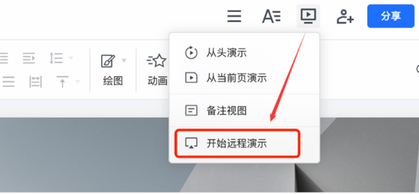 1、首先要先创建远程演示,进入任意的幻灯片后,点击右上角的【演示】的图标,选择其中的【开启远程演示】;