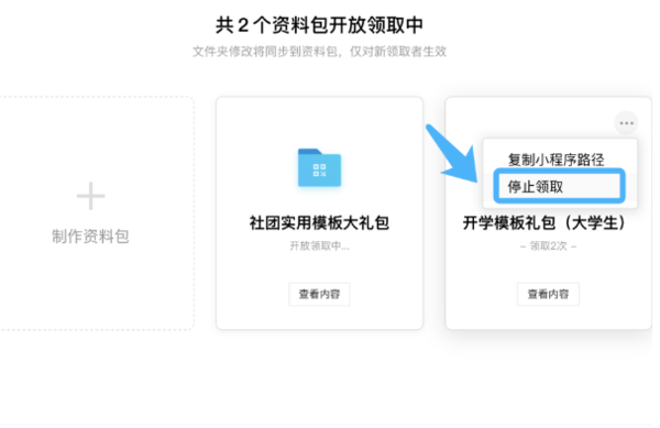 5、可以对资料包设置领取权限,使其停止领取或继续开放领取。