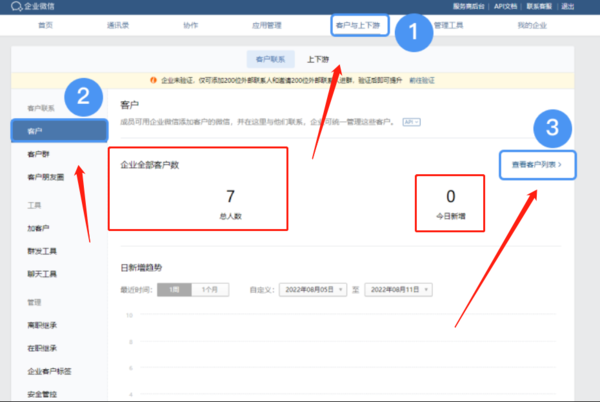 登陆企业微信管理后台,在上方选择【客户与上下游】,随后在窗口左侧找到【客户】,在这里可以看到当前企业的全部客户数量以及新增数量和变化趋势,点击右侧的【查看客户列表】即可查看客户详细信息了。