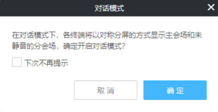 在对话模式下,当有分会场参与对话时,其他参会终端上均以对称分屏的方式显示主会场和发言终端的互动画面,该显示效果仅对会议室系列和NE90系列终端生效。