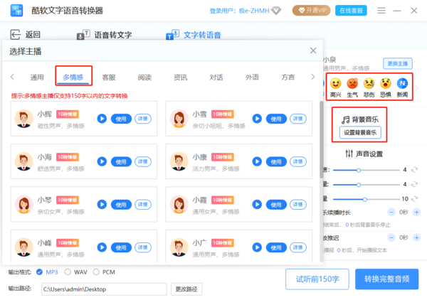 同时在进行文字语音转换的时候,还拥有非常丰富的主播可以进行选择,还能够设置主播语气、背景音乐等功能。而语音转文字时还支持英文转换,转换格式的选择,能够更好的满足大家的日常转换需求。
