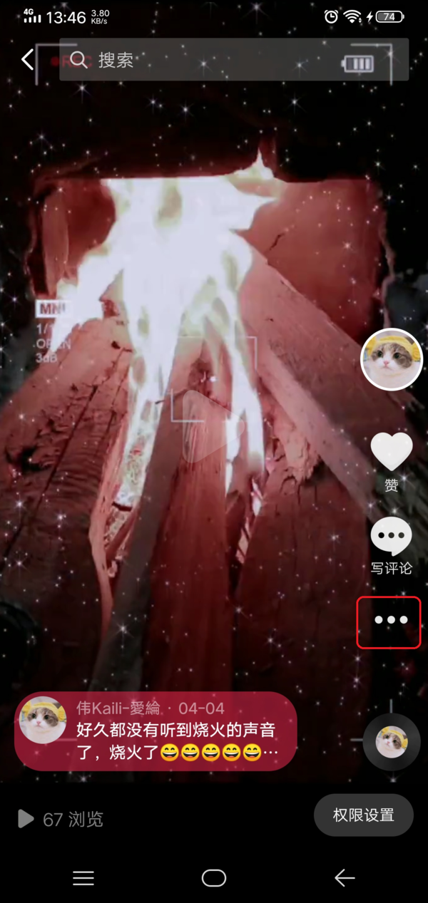 第三步,进入到作品视频的播放界面当中后,找到右侧的【....】三个点的图标,并点击它。