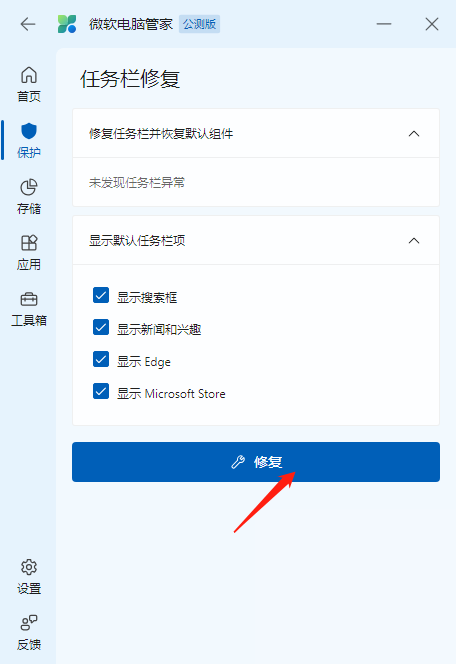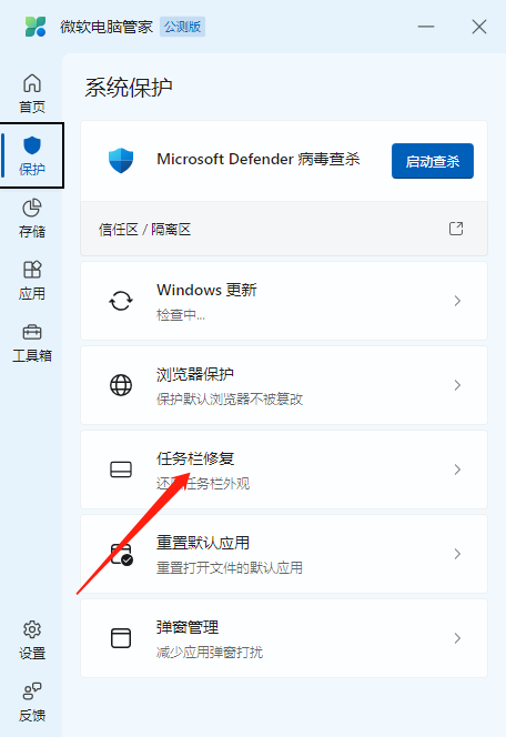 1、在微软电脑管家保护界面中,点击【任务栏修复】选项。