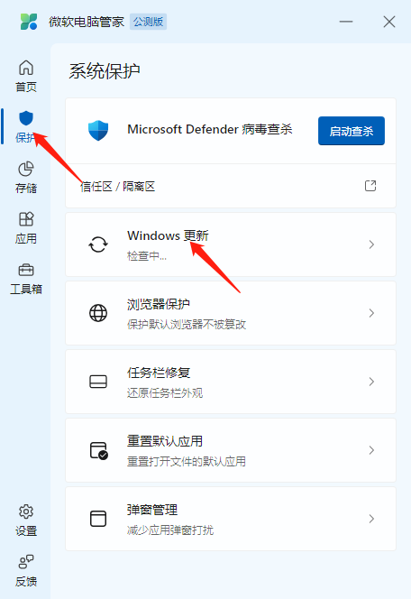 1、启动电脑端的微软电脑管家,点击界面左侧列表中的【保护】功能,然后点击【Windows更新】功能。