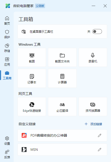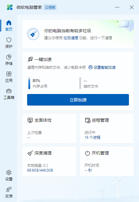 3、界面设计:与360安全卫士相比,微软电脑管家的界面显得更加干净整洁,它是以一个类似QQ界面的长条状显示在桌面上,且软件功能分类明确,一目了然、清晰可见。