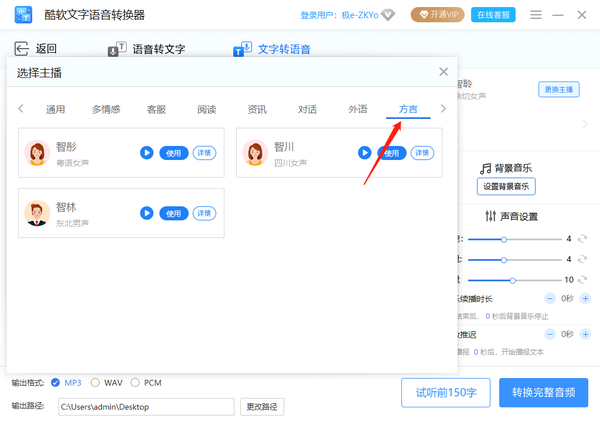 金舟文字语音转换软件支持七种国内方言,他们分别是:浙江、四川、台湾、东北、湖南、天津、粤语。每一种方言还有多个风格版本,比如男女声、个性语气等,都是可以随意调节的。