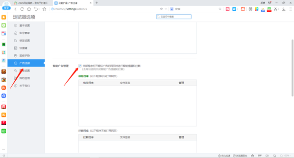 3、在设置界面左侧一栏中选择【广告过滤】,找到【智能广告管理】,勾选【外部程序打开意思广告的网页时进行智能提醒和拦截】,然后重新打开浏览器就可以啦。