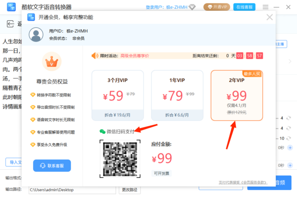 介绍完了酷软文字语音转换器付费后仍不是会员问题的解决方法后,那么目前酷软文字语音转换器vip会员的付费方式有什么呢,继续往下看吧。