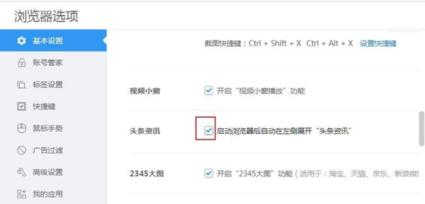3、如下图所示,在基本设置中,右侧会有一个“头条资讯”的区域,可以看到“启动浏览器后自动在左侧展开头条资讯”的功能是打开的,如果想要关闭,就点击蓝色的对勾标志,将对勾取消掉,这样就关闭掉头条资讯的广告提醒功能了。