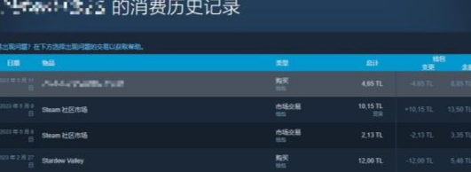 3、在这里就记录着steam上所有的消费记录了,可以查看日期、交易来源、物品信息等等;