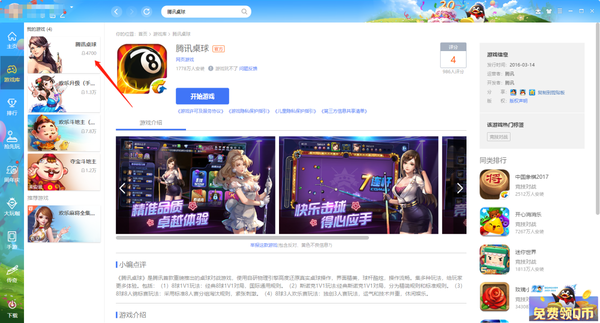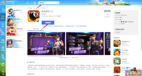 1、首先启动QQ游戏大厅并登录。登录后在搜索框输入【腾讯桌球】,点击【开始游戏】会进行安装,然后会自动进入到腾讯桌游界面。