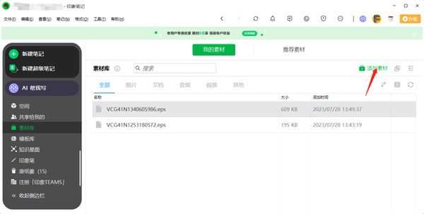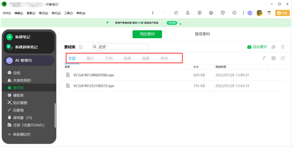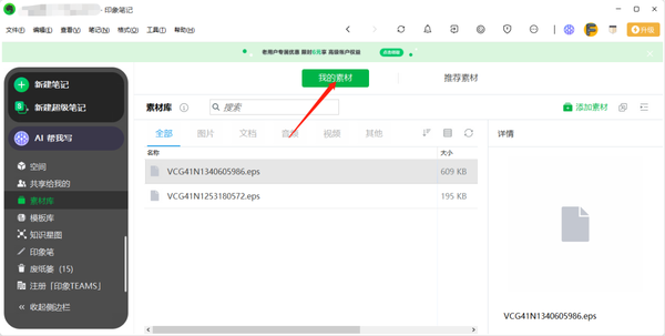 1、在印象笔记的【素材库】界面中,,点击上方【我的素材】,以切换到自己用过的素材界面。