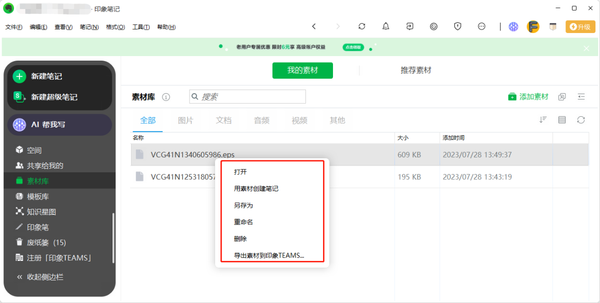 3、对于单个素材,我们可以查看的是它的名称、大小以及添加它的日期;接着,我们可以右键单击某素材,以进行打开、创建笔记、另存为、删除等操作。