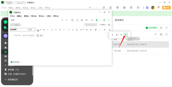 4、当我们新建笔记需要使用素材时,点击【添加素材库附件】即可。