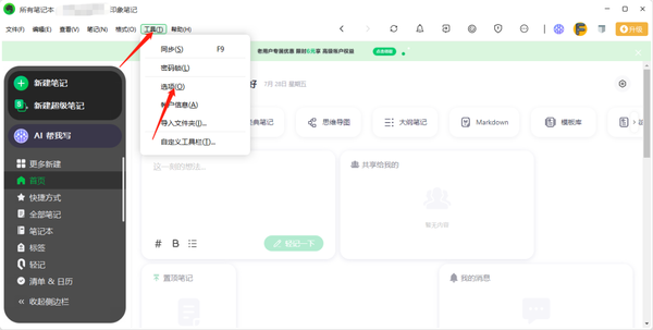 1、点击印象笔记上方菜单栏【工具】,选择【选项】进入。
