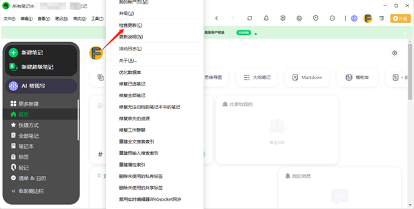1、打开印象笔记,点击软件主界面菜单栏的【帮助】,找到并点击【检查更新】。