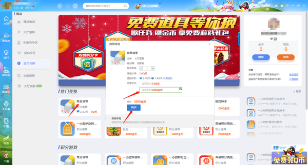 2、我们点击想要兑换的商品名称进入到商品信息界面,选择购买数量,优惠方式选择【金币支付】,然后点击【购买】即可。