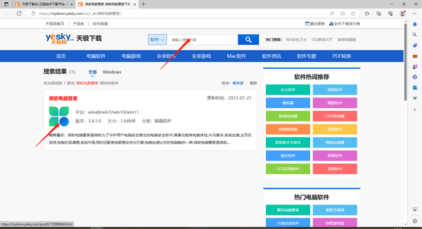 方法二:在财神爷站站进行下载,打开财神爷站站后再搜索框中输入【微软电脑管家】,点击下方软件图标进入软件介绍界面。