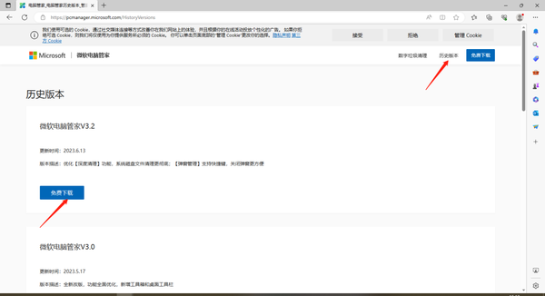 方法一:从网页搜索引擎中输入【微软电脑管家】,找到微软电脑管家官网并点击进入,然后点击右上方的【历史版本】,点击进入就可以看到过往的历史版本了,选择想要的历史版本点击【免费下载】,按照步骤进行即可。