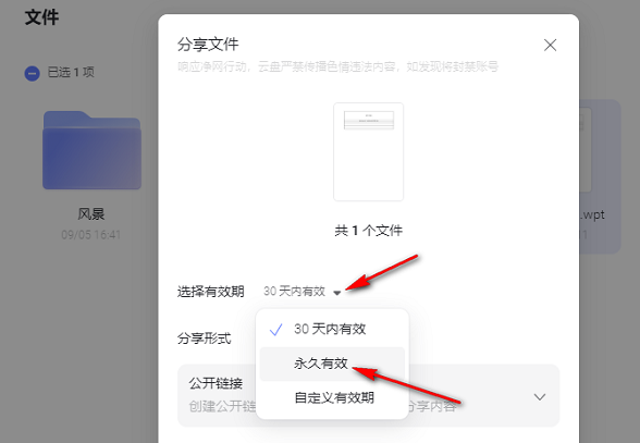 2、在出现的窗口中,找到【选择有效期】,在这里选择【永久有效】即可,这样的话文件就是永久分享状态了,不会过期了,且我们还可以自定义有效期;