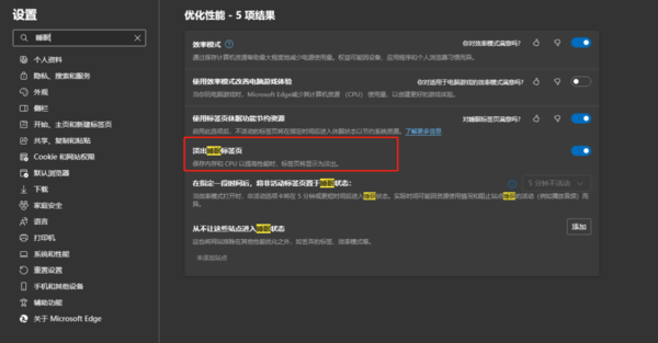 3、开启【淡出睡眠标签页功能】,保存内存和CPU以提高性能,标签页将显示为淡出,并不会自动加载。