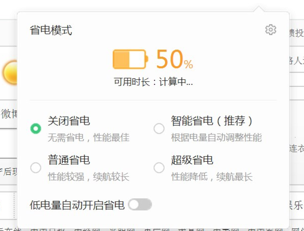【360浏览器】中,省电模式被开发成三种,分别是【智能省电】、【普通省电】、【超级省电】,大家可以根据当前所需,随心所欲的选择。且我们可以在浏览器高级设置中,让省电模式在低于某一电量时自动开启,非常方便。